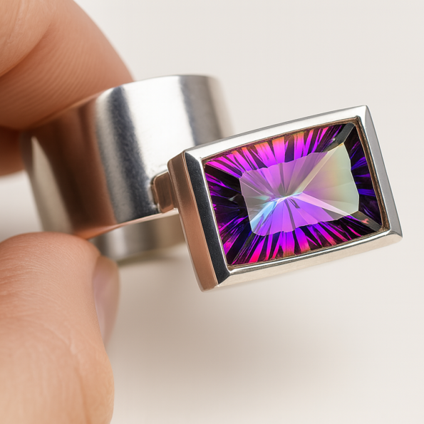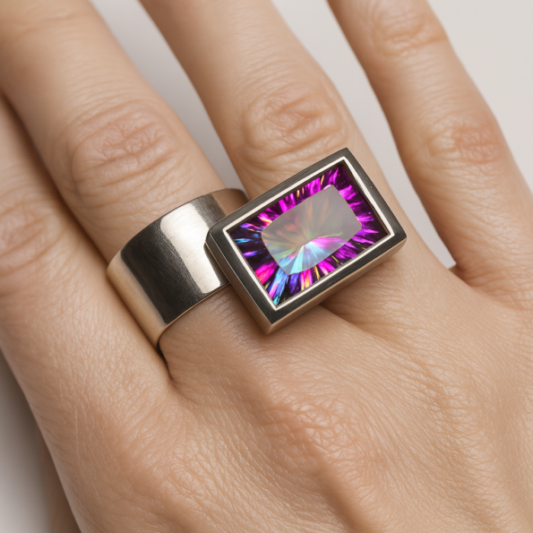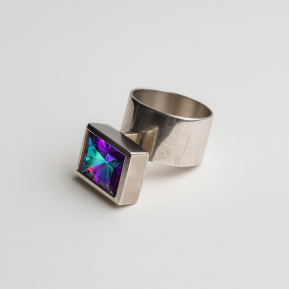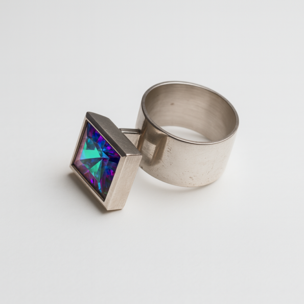 Universo desplazado cuestiona la idea de encajar. No busca un lugar fijo, sino la expansión de los límites. La piedra evoca los colores cambiantes de una nebulosa. Es una declaración de lo inclasificable, un recordatorio de que intentar encajar no siempre es lo mejor: a veces, la verdadera fuerza está en desbordar las formas y abrir espacio a lo múltiple.